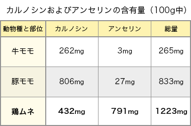 主要動物種屬肌肉部位的含量為牛大腿:肌肽262mg、鵝肌肽3mg,豬大腿:肌肽806mg、鵝肌肽27mg、雞胸肉:肌肽432mg、鵝肌肽791mg(各100g含量),可以看到雞胸肉的總含量是迄今為止最大的。此外,當人類從肉類中攝取時,在體內被消化吸收的咪肽(咪唑二肽)是其中的一部分,並非全部被吸收。