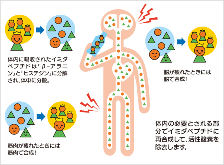 咪唑胜肽化合物(咪唑二肽)被稱為“二肽”,由兩個胺基酸結合而成。被消化吸收後,在體內分解為“β-丙氨酸”和“組氨酸”兩種胺基酸,然後由血液攜帶至全身。