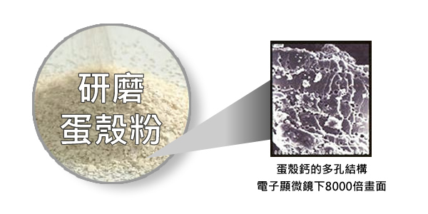 蛋殼的主要成分是碳酸鈣,佔了大約九成,再來是碳酸鎂、磷酸鈣以及膠質。含鈣量大約 35%,非常豐富。