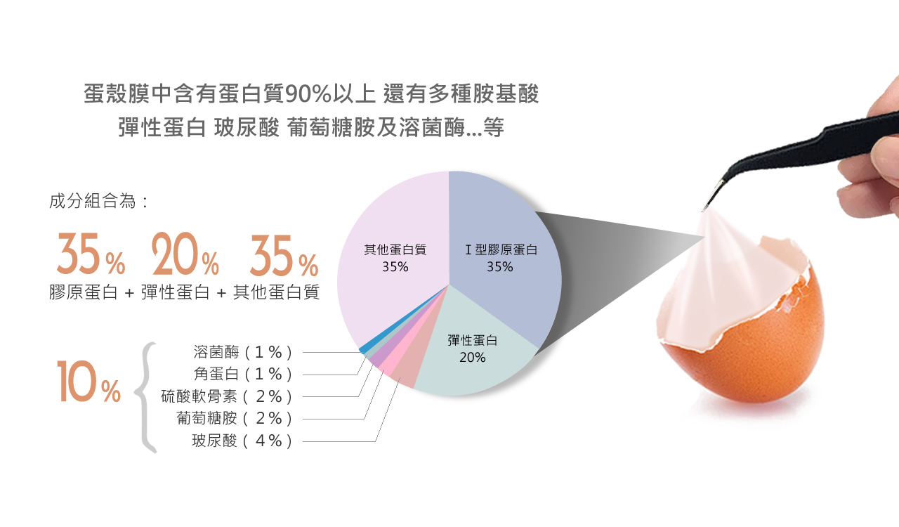 蛋殼膜的組成主要為蛋白質 (80-85%),而其中大約 10% 是膠原蛋白 (typeⅠ、Ⅴ、Ⅹ),70-75% 是其他蛋白質與醣蛋白。而在蛋殼與蛋殼膜的蛋白質加總有 500 種,即使是我們常說的食用蛋白也只有 148 種,而蛋黃內也只有 316 種,相比較下,蛋殼膜所含有的蛋白質才是整個蛋的精華成分。此外,蛋殼膜上更含有許多獨特的營養素,包含支鏈胺基酸、必需胺基酸、角蛋白、溶菌酶 (lysozyme)、卵轉鐵蛋白 (ovotransferrin)、卵清蛋白 (ovalbumin)、玻尿酸 (hyaluronic acid)、硫酸軟骨素 (chondroitin sulfate) 與葡萄糖胺 (glucosamine)。