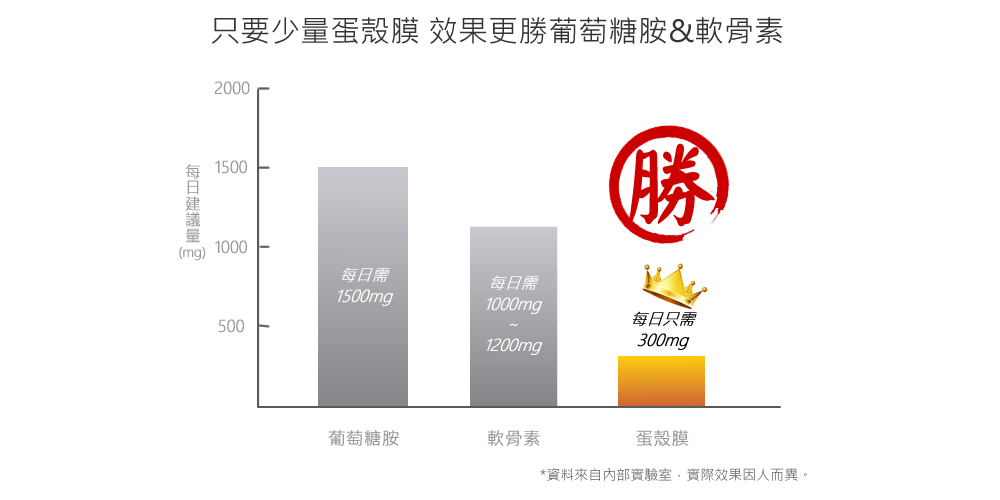 UCⅡ® / UC2 在行動力上面的保健功效,不容置疑,有許多的研究證實了 UCⅡ® / UC2 的功效,並且食用量極少,在原廠的臨床食用量上每日只需要 40 毫克。而在蛋殼膜上,也同樣經歷的大量的臨床證據,但這兩款的差異呢? UCⅡ® / UC2 的食用後體感度一般建議需要 90 天,而蛋殼膜的體感度建議是 30 天。若同樣使用一般在評估上的指標 來看,蛋殼膜則是在體感分數上更為勝出。