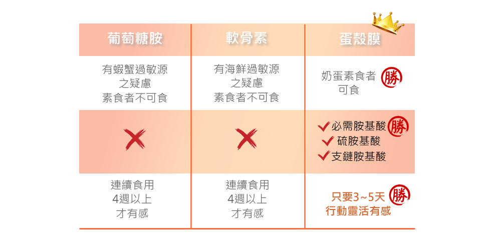 除此之外,蛋殼膜來自新鮮雞蛋,UCⅡ® 主要來自雞軟骨,而葡萄糖胺或軟骨素來來源自蝦蟹等甲殼類生物,所以蛋殼膜不但可以避免許多對於海鮮有潛在性過敏的族群,食用上更為安全。